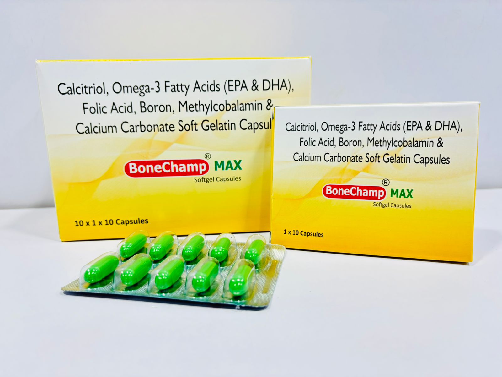 BoneChamp MAX is a dietary supplement that combines Calcitriol, Omega-3 Fatty Acids (EPA & DHA), Folic Acid, Boron, Methylcobalamin, and Calcium Carbonate. This combination is typically formulated to support bone health, cardiovascular health, and overall well-being. Below is a breakdown of the uses and typical dosages for each component in BoneChamp MAX